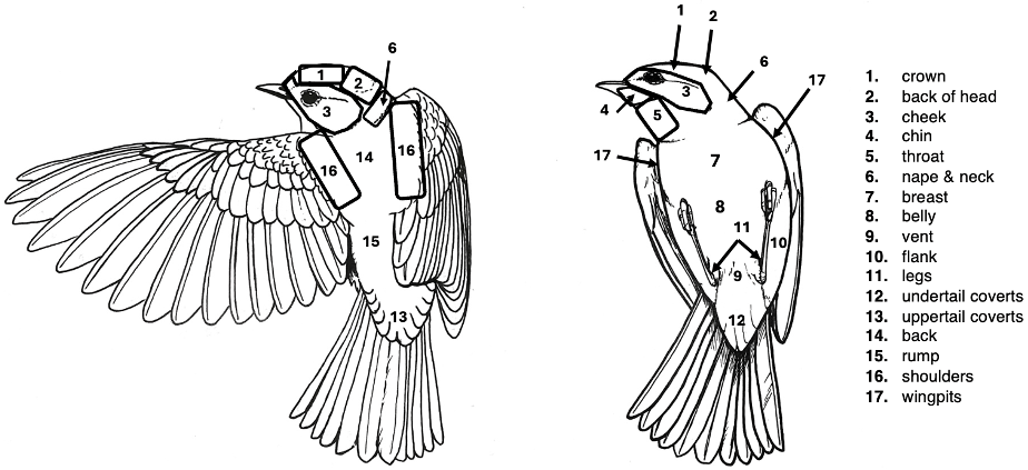 Fig. 1. Diagram of 17 contour feathers patches in which we scored prealternate molt intensity. Illustration by Stephen Joly.