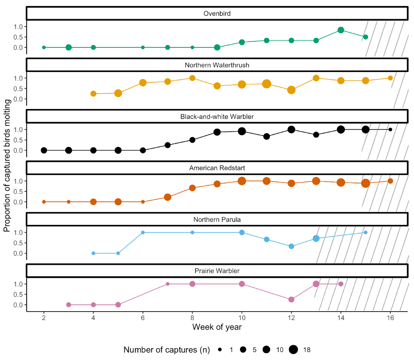 Fig. 2. The proportion of captured birds of six species molting by week of year from 13 January through 18 April 2023, at Font Hill Nature Preserve, Jamaica. The size of the circles represents the number (n) of captured birds per week. The hatched area shows where the molting period overlaps with the early end of migration departure windows from Jamaica for each species, based on eBird data (Fink et al. 2023) and unpublished tracking data from the study site (unpublished data, BCD and PPM).