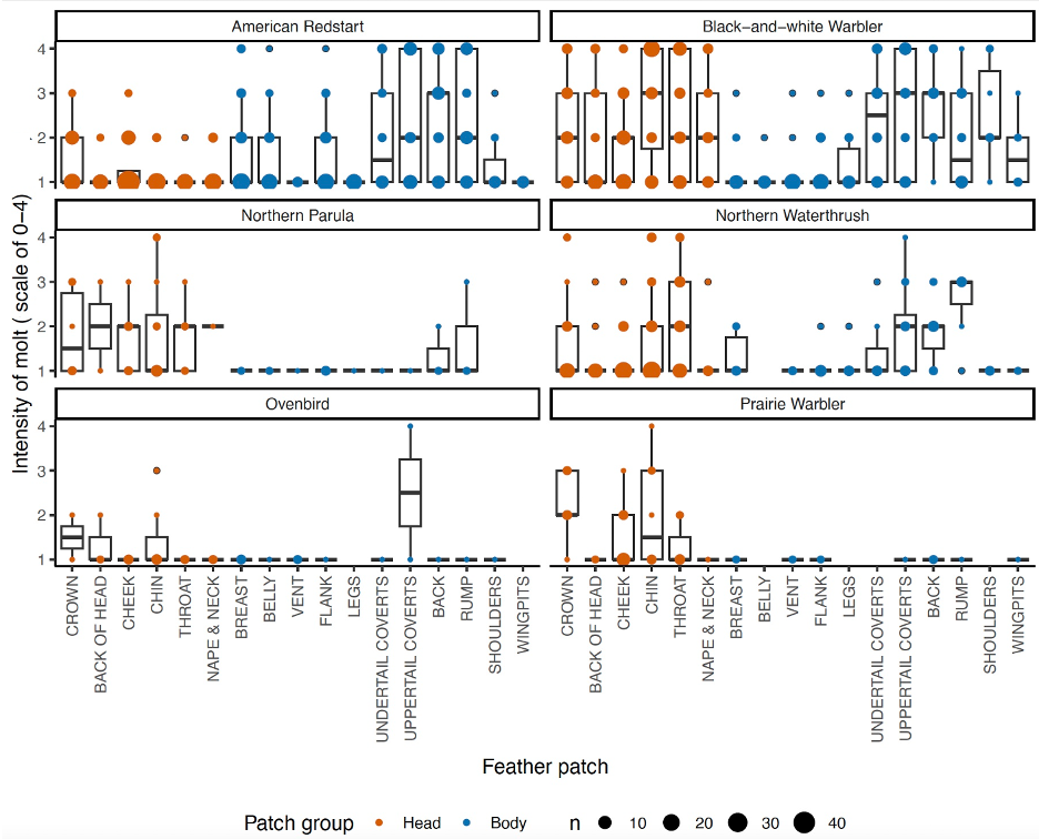 Fig. 3. The intensity of molt, on a scale of zero to four, per 17 feather patches for six species captured from 13 January through 18 April 2023, at Font Hill Nature Preserve, Jamaica. The size of the circles represents the number (n) of molting birds sampled that had the corresponding molt intensity score for each patch.