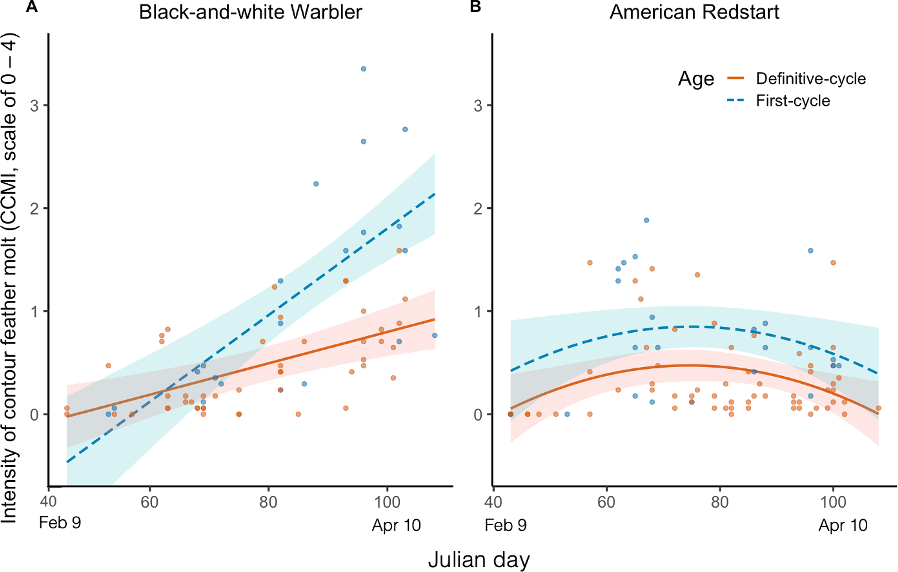 Fig. 4. Effects of Julian date and age on contour feather molt intensity, measured as a Combined Contour Molt Index (CCMI) on a scale of zero to four. The relationship between CCMI and Julian date is linear in Black-and-white Warblers, Mniotilta varia (A) and quadratic in American Redstarts, Setophaga ruticilla (B). Models include data from the first date we observed molt: 15 February for Black-and-white Warblers and 12 February for American Redstarts, through the end of the study period, 18 April 2023. The lines represent the predicted relationships between CCMI and Julian date for each age class (definitive-cycle in solid, first-cycle in dashed). The data points shown are the predicted values. The shaded areas represent the 95% confidence intervals of the prediction.