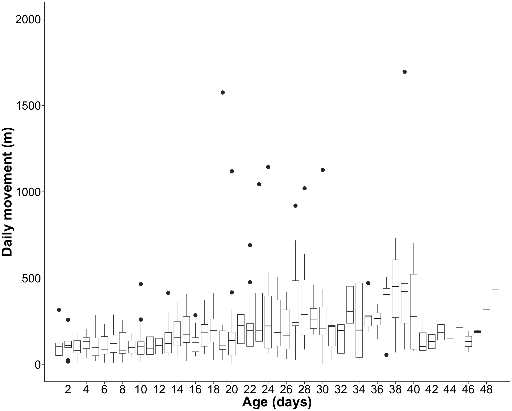 Fig. 2. Daily movements from previous day made by fledgling Boreal Chickadees in 2020–2022 in northern Minnesota, USA. The dashed line represents the average age post-fledge of independence from parents.