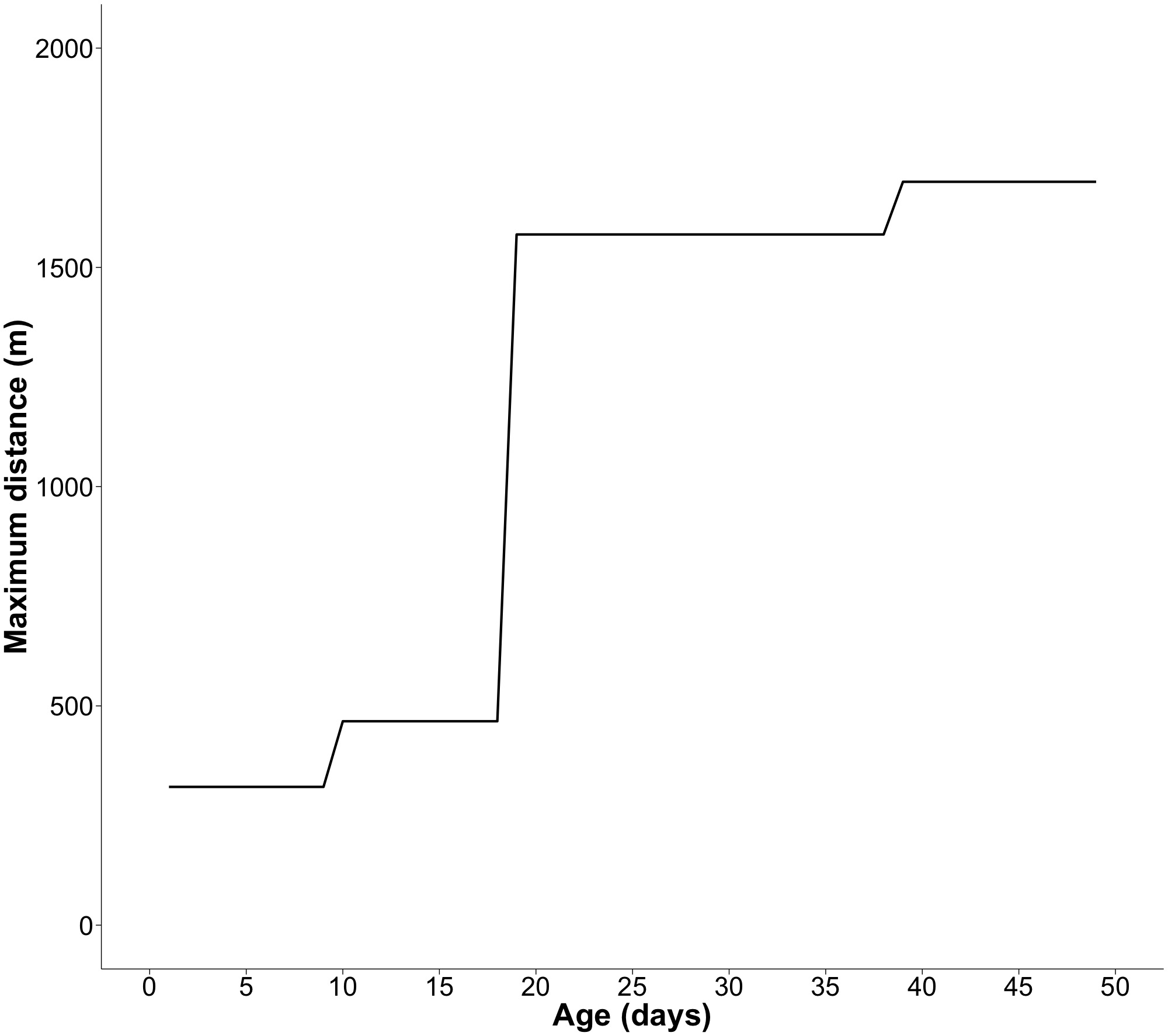 Fig. 3. Observed maximum daily movement by any fledgling Boreal Chickadee of a given age from 2020–2022 in northern Minnesota, USA.
