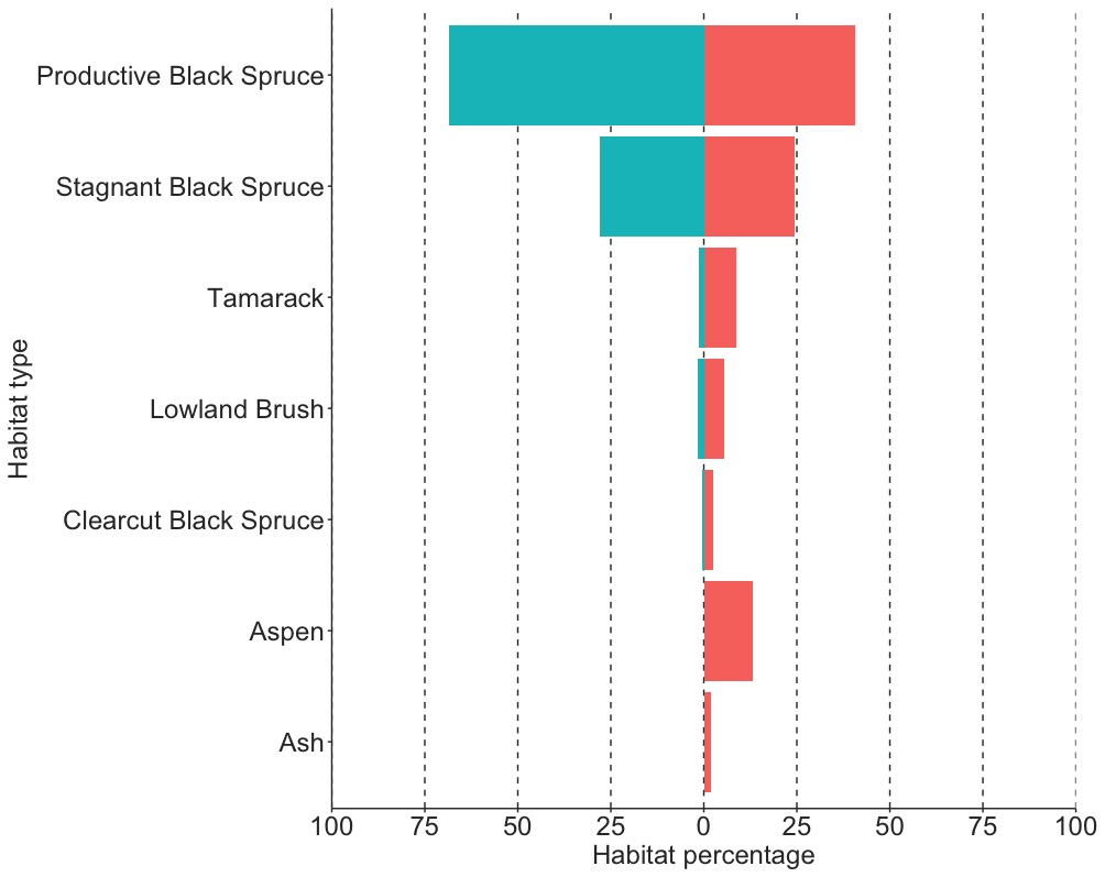 The average number of cover types within 3 km of each study site was 20.5 ± 5.2 SD (range 13–24). The most common cover types within this area were tamarack (19.7% ± 11.8%), aspen (18.5% ± 7.1%), productive black spruce (16.2% ± 7.9%), lowland brush (15.3% ± 5.5%), and stagnant spruce (8.3% ± 9.0%; Appendix 1).
