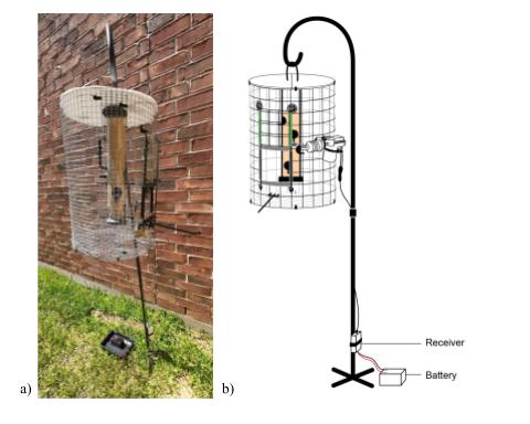 Fig. 1. (a) Photo of the remotely closing trap fully set up with a tube feeder in the center. (b) Labeled diagram of the remotely closing trap set up with a tube feeder in the center. Diagram credit: Jacie Woznicki.
