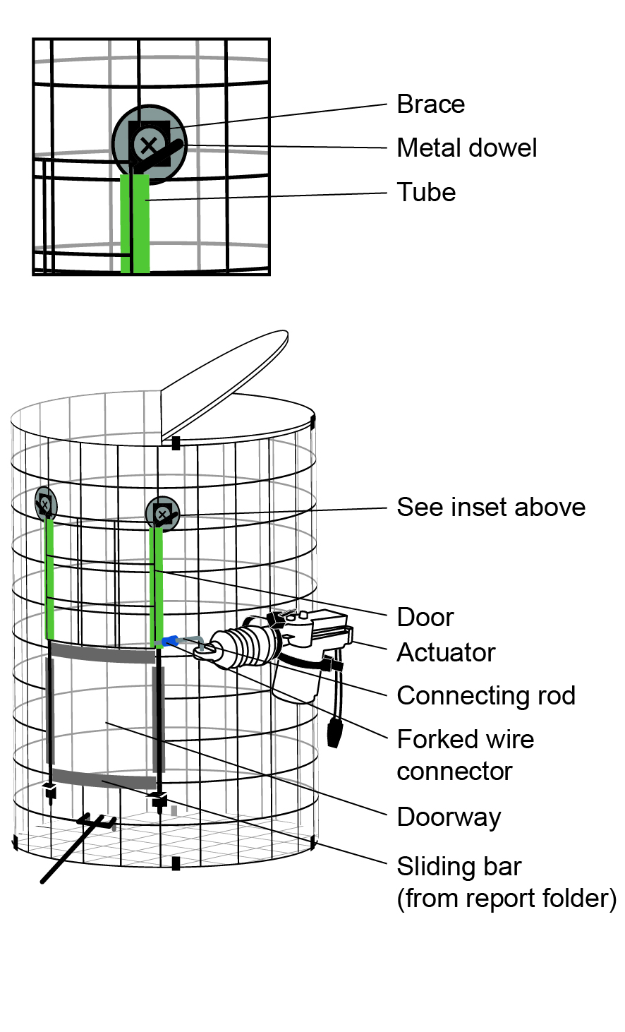 We attached two metal dowels vertically on the trap, one on each side of the doorway, to act as tracks on which the door could slide. These dowels needed to be greater than twice the height of the door, so that the door could slide up to leave the doorway open and slide down to cover the full doorway. We attached the dowels to the trap using four small, single-hole L-shaped corner braces (Everbilt ¾ in. Black Corner Brace, 4-pack), ensuring that the size of the holes in the braces were larger than the diameter of the dowels. Each brace was attached to the trap by using a bolt, washer, and wing-nut (Fig. 3 inset). For each dowel, a brace was placed near the top of the cage and one just below the lower edge of the doorway, both just outside of the vertical edge of the doorway. We secured the dowels in the braces by bending the dowel a few centimeters from one end, then sliding the long, straight section of the dowel through the hole in the top brace, through the tube on the side of the door, and then through the hole in the bottom brace (Fig. 3). We ensured that the door would drop on its own once released from above the doorway and that it fully covered the doorway when resting at the bottom of the track. Covering the bottom edge of the door with electrical or duct tape ensured that no one would get scratched by the door.