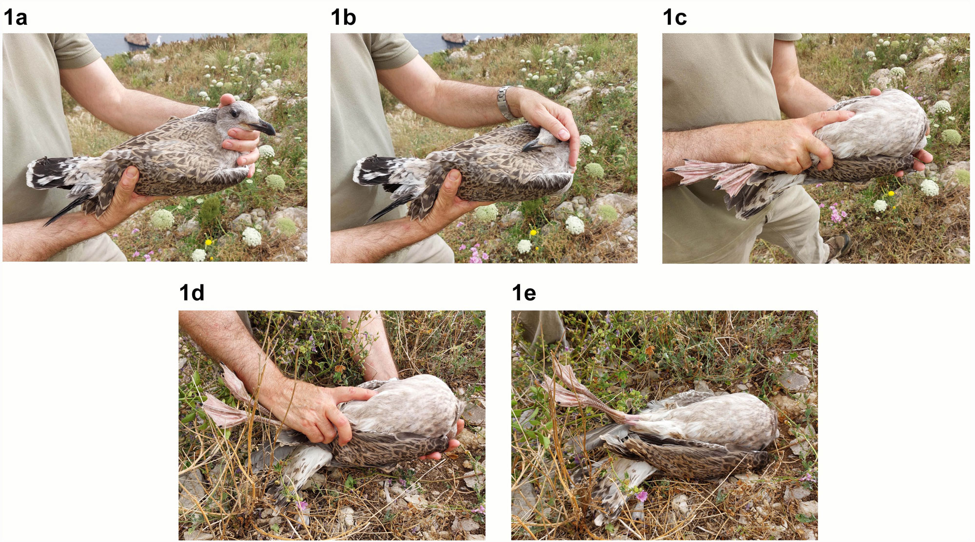 Fig. 1. Sequence of the procedure to keep the chick within its territory after handling: (1a) immobilization of the chick’s wings and legs with one hand and its head with the other; (1b) turning the head and pressing it against the back, attempting to cover the eyes; (1c) turning the chick onto its back; (1d) and (1e) placing the chick on the ground. For a detailed description, see the text.