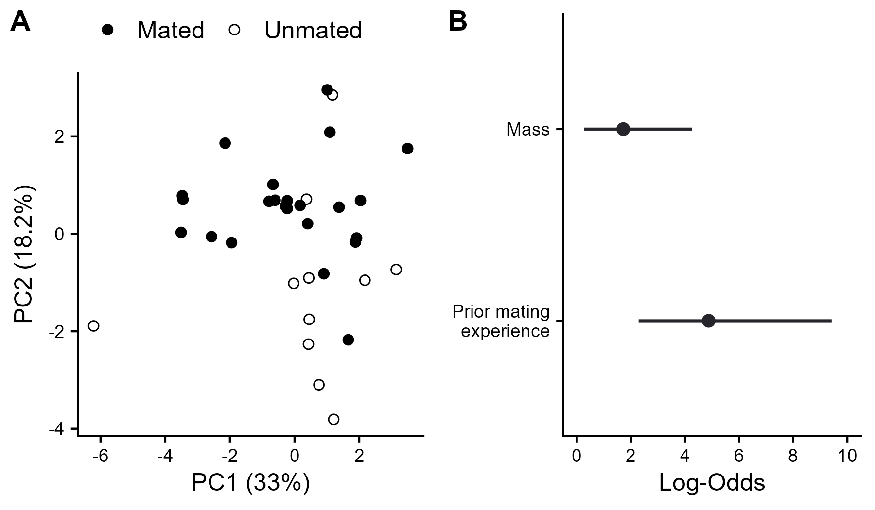 Fig. 1. Mass and prior mating experience differentiate mated and unmated males - (A) First and second principal components of 13 male traits colored according to male mating status. (B) Estimated log-odd effects (and 95% confidence intervals) of mass and prior mating experience on mating status from the top logistic regression model. Because neither interval includes zero, both higher mass and prior mating experience can be interpreted as having had a positive effect on mating success. This figure represents only data collected in 1993, for which we had multiple metrics capturing different elements of bird size, timing, territory quality, song quality, etc. The loadings for PC1 and PC2 are complex (see Append. 3), but the data reveal some separation between the traits of mated vs. unmated males.