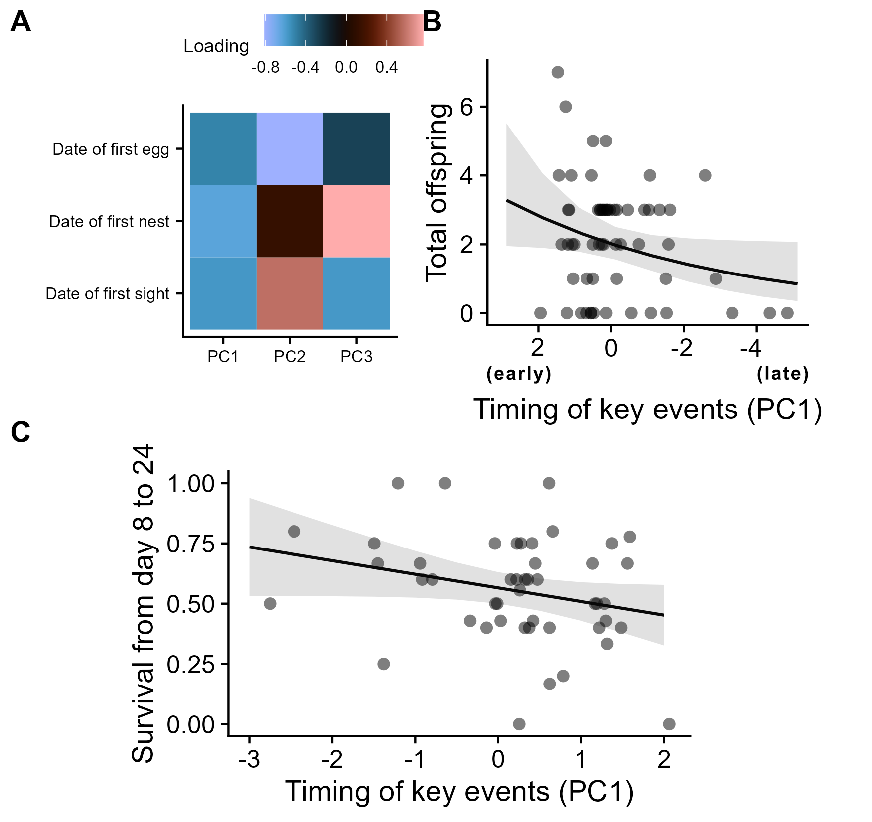 Fig. 3. Earlier breeding females produce more total offspring but may experience a trade-off between fecundity and offspring survival. Timing of key events affects total offspring and offspring survival differently. (A) Loadings for principal components of dates of key breeding events. PC1 explains 63% of the variance of total offspring produced and measures timing from early to late (note that loadings for PC1 are negative). The timing variables are positively correlated only for PC1, suggesting the other PCs are less useful. (B) Effect of timing of key events (PC1 in A) on the total number of 24-d offspring from a generalized linear model. (C) Effect of timing of key events on survival of offspring from day 8 to day 24.