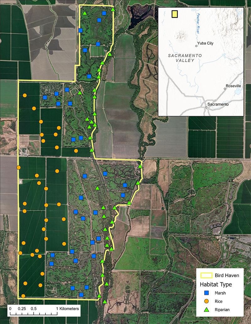 The Sacramento Valley (northern third of the Great Central Valley ecoregion) is a 2497.57 sq km heterogeneous matrix of natural and agricultural areas across public and private lands. Understanding how species use this landscape remains fundamental to our ability to conserve species diversity and abundance as well as habitats of conservation importance (Rich et al. 2018). In the Sacramento Valley, coordinated efforts have been implemented to target landscape-level wetland, riparian, and grassland habitat restoration projects, emphasizing private land corridors linking protected federal and state refuges (Central Valley Joint Venture 2020).