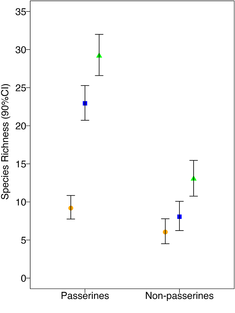 Fig. 2. Estimated passerine and vocalizing non-passerine species richness by habitat (native riparian, marsh, and rice) at Bird Haven Ranch (BHR) in Glenn County, California. In total, 33 native riparian, 31 marsh, and 32 rice sites were surveyed using automated recorders between 2019 and 2021. Species richness is represented along the y-axis and passerine and non-passerine groupings by habitat type are displayed along the x-axis. Species richness estimation points are represented as a green triangle, blue square, and orange circle for native riparian, marsh, and rice habitat, respectively, and 90% credible intervals are denoted by the black bars.