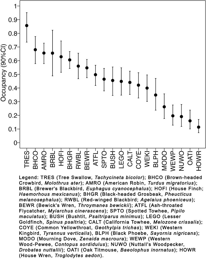 Fig. 3. Estimated total occupancy (all habitats combined) of the most common avian species (naive occupancy > 0.25) at Bird Haven Ranch (BHR) in Glenn County, California. In total, 33 native riparian, 31 marsh, and 32 rice sites were surveyed using automated recorders between 2019 and 2021. Total occupancy was calculated using weighted occupancies determined by percent cover of each habitat on the property. Occupancy is represented along the y-axis and individual species results are displayed along the x-axis. Species from left to right show decreasing order of estimated occupancy. The species are identified with four-letter alpha codes, with full names provided in the legend. Single species estimated occupancy are represented as a black circle and 90% credible intervals are denoted by the black bars.