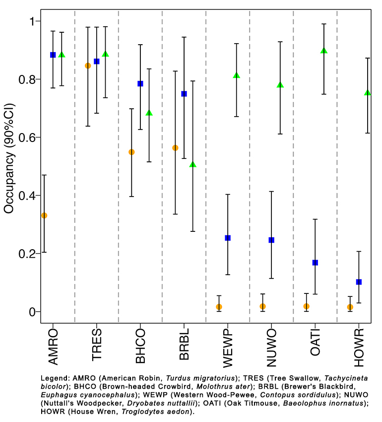 We calculated the estimated occupancies by habitat type for a select number of the most detected bird species (naive occupancy > 0.25) at BHR to assess drivers characterizing avian occupancy on BHR (Fig. 4). We chose to investigate the species with the highest and lowest total estimated occupancies of the 21 most common species determined in Fig. 3. The 90% credible intervals of the posterior distributions comparing the difference between the average estimated occupancy for all habitat combinations (marsh and rice, native riparian and marsh, native riparian and rice) for each species is included as Table A4.1. Any habitat combination that produced a posterior distribution that differed from zero was interpreted to have meaningfully different estimated occupancies. Western Wood-Pewee (Contopus sordidulus), Nuttall’s Woodpecker, Oak Titmouse, and House Wren had meaningfully different estimated occupancies between all habitat types, with a strong preference for native oak-ash riparian habitat. American Robin had no meaningful difference in estimated occupancy for marsh and native riparian habitats but did prefer those habitats over rice. Brown-headed Cowbird had a meaningful difference in estimated occupancy between rice and marsh habitats only. Tree Swallow and Brewer’s Blackbird showed no meaningful difference in estimated occupancy between any of the habitat types at BHR. Brown-headed Cowbird, Tree Swallow, and Brewer’s Blackbird lack of habitat preferences and moderately high occupancies across all habitat types indicates their ability to generalize.