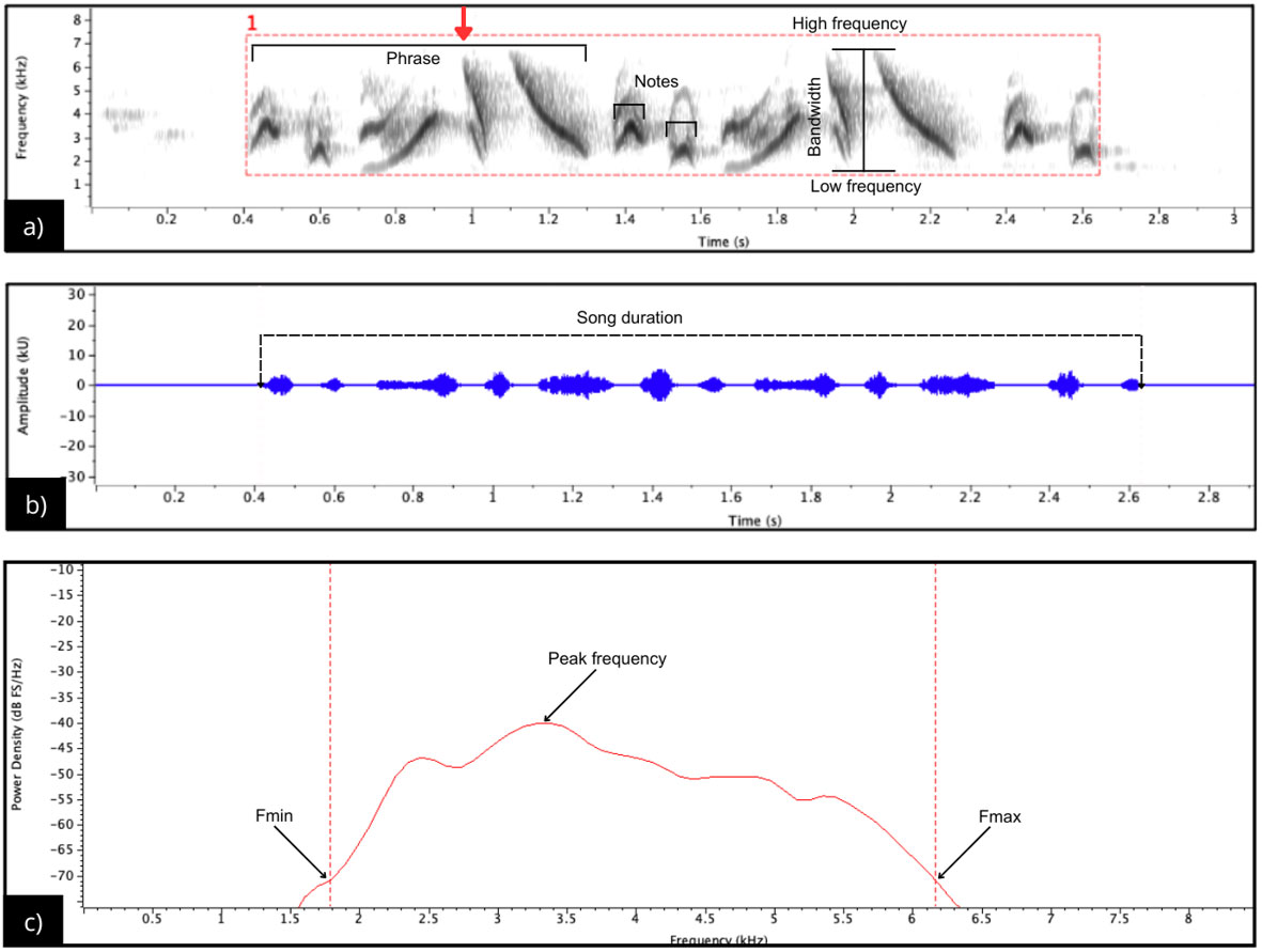 Fig. 2. Acoustic structure of Geothlypis beldingi song from San Ignacio: (a) spectrogram illustrating the temporal and frequency components used to measure song parameters (Hanning window, 90% overlap, 512 samples DFT). The song consists of two phrases of five notes each, followed by two terminal notes similar to introductory ones. A red arrow marks a note type observed only in songs from San Ignacio; (b) oscillogram showing how song duration measured; and (c) power spectrum indicating how minimum and maximum frequencies were determined using the threshold method.