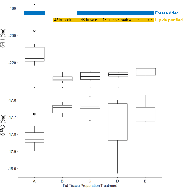 We experimented with fat from the same individual chicken to test whether δ2H and δ13C values varied with different methods of sample preparation. We found that freeze drying had a small but significant impact on δ2H values but not δ13C values. As expected, water in lipid samples likely had different δ2H values than those contained in bird fat, and therefore residual water would alter hydrogen isotope ratios. Other studies involving soft animal tissues freeze dry samples prior to stable hydrogen isotope analysis (e.g., Wassenaar and Hobson 2000a, Hobson et al. 2004b, Keenan and DeBruyn 2019), stable carbon isotope analysis (Podlesak and McWilliams 2007, Génier 2025), and fatty acid analysis of lipids (e.g., Pierce and McWilliams 2005, McCue et al. 2009), and is a recommended preservation method to prevent sample decomposition (Elliot et al. 2023). We therefore recommend freeze drying fat tissue samples prior to lipid purification until there is strong evidence that it is not necessary.