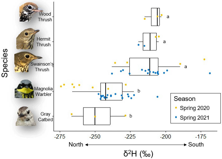 Fig. 2. The δ2H values (reported in per mil notation) of fat sampled from five species of presumed distant-origin migrating songbirds at Powdermill Nature Reserve in southwest Pennsylvania, USA during the spring 2020 and spring 2021 migration seasons. Different lowercase letters next to each species indicate statistical differences between δ2H values and same lowercase letters indicate no statistical differences between δ2H values.