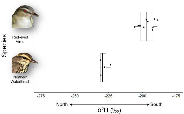We used t-tests to compare stable hydrogen and stable carbon isotope values between the two species with presumed local-origin fat (Northern Waterthrush, Red-eyed Vireo) to test whether two species that presumably foraged and assimilated fat in the same location showed comparable stable-isotope values.